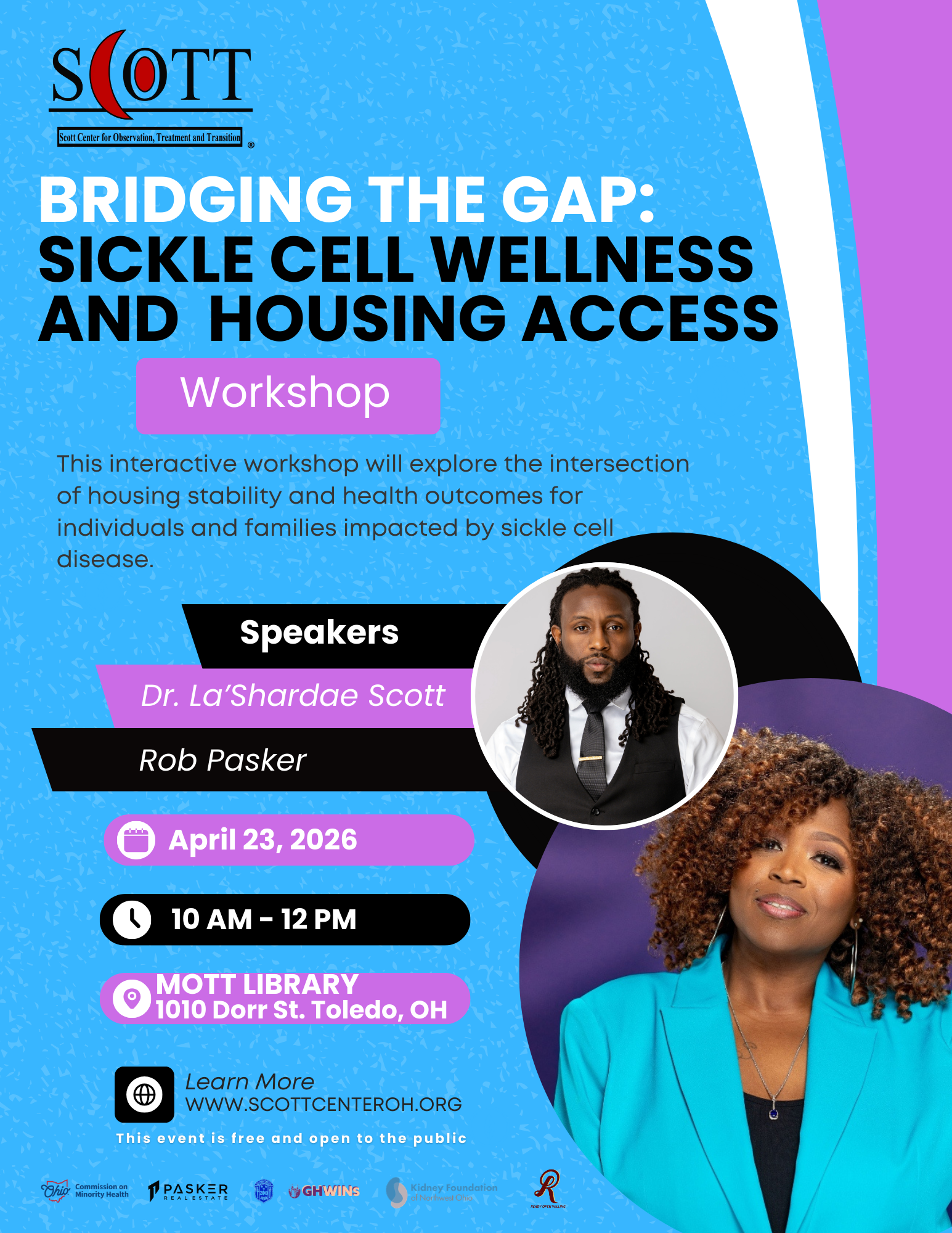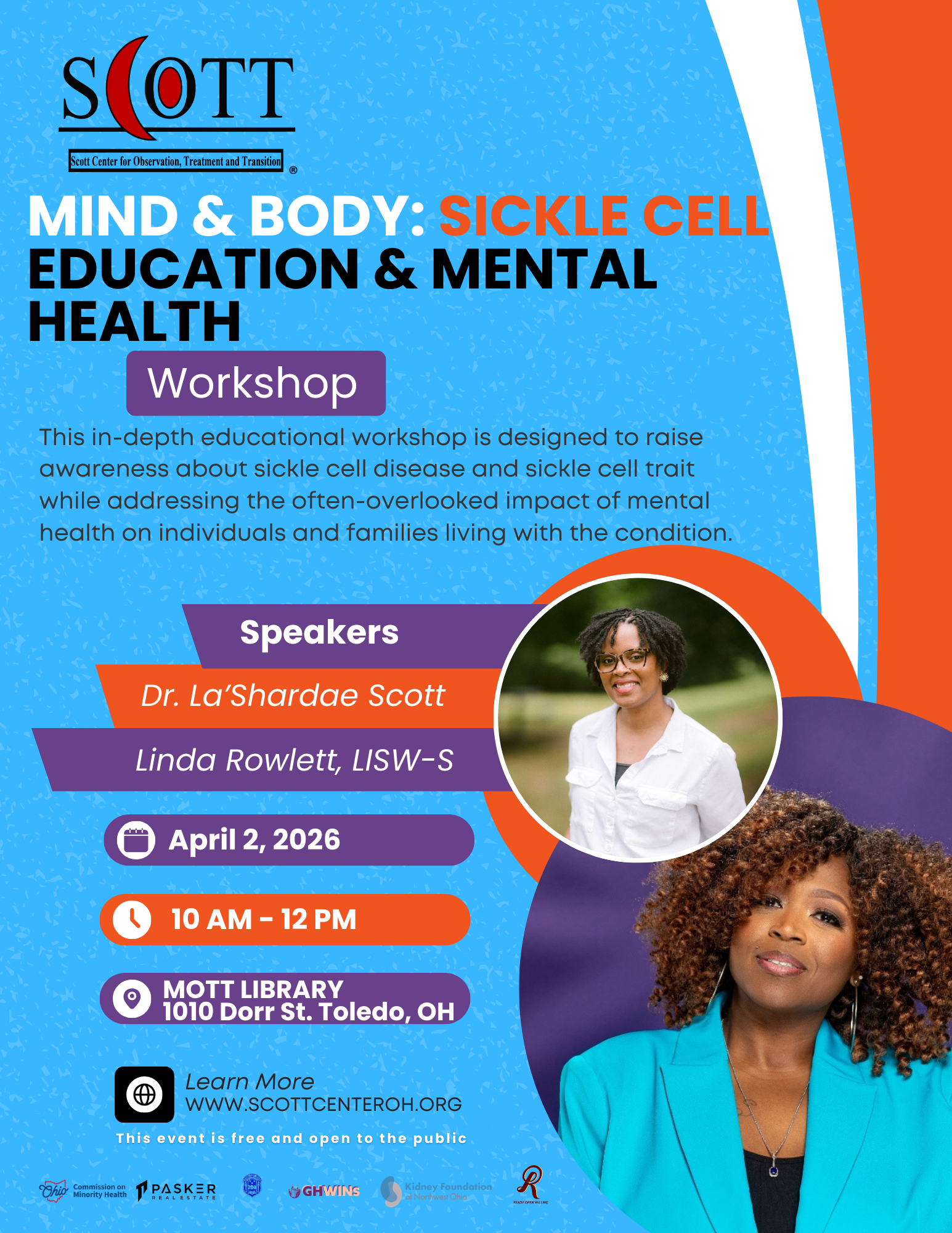 The Scott Center for Observation Treatment and Transition (S.C.O.T.T.) is a 501(c)3 non-profit organization founded in 2022 that assists families and individuals with sickle cell disease in transitioning from pediatric to adult care and minimizing infant mortality in communities of color. This community-based organization bridges the gap between medical professionals and patients by advocating on a medical, educational, or familial level.