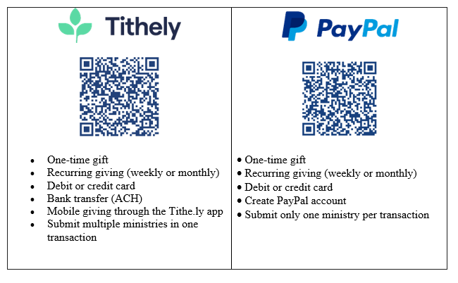 For your convenience, you can give securely using QR Codes or click Tithely or PayPal button below.
